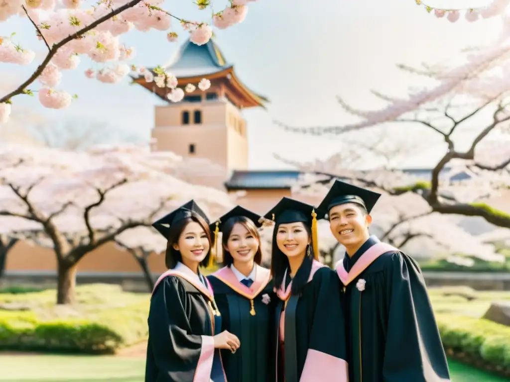 Grupo de estudiantes japoneses celebrando su graduación en un jardín de cerezos en flor