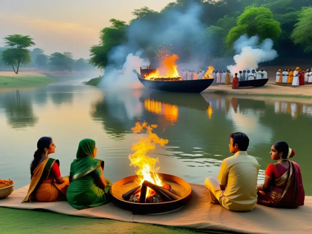 Ceremonia hindú Antyesti: familiares y líderes religiosos rodean la pira funeraria en un emotivo rito